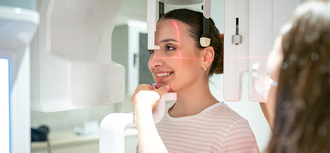 Röntgenbilder sind ursprünglich zweidimensional, ähnlich wie Fotos, die Sie anschauen. Da jedoch Ihre Zähne und Kieferknochen in der Realität dreidimensional sind, bietet es einen erheblichen Vorteil für spezifische Diagnosefragen, die Strukturen auch dreidimensional zu planen und zu betrachten. Dadurch können Planungen und Operationen oft detaillierter und schonender durchgeführt werden. Es ermöglicht auch eine optimale Nutzung des vorhandenen Knochenangebots und eine genauere Einschätzung des Aufwands.